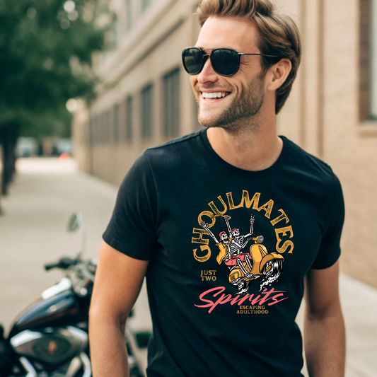 GHOULMATES Spirits Classic T-Shirt – Halloween Scooter Skeleton Graphic Tee